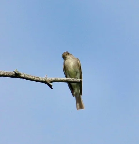 Sometimes the birds are curious about us too! An Eastern Wood-Pewee (Contopus virens) spotted high on a dead branch. Photo by Jim Gant